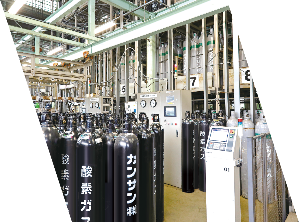 いまや「ものづくり」の現場では、必要不可欠となっている「高圧ガス」。私たちがなにげなく使っている日用品も、多種多様なガスがなければ製造することができません。酸素・窒素・アルゴン・炭酸ガスなど、生産活動のエネルギーとなる高圧ガスを製造~供給~メンテナンスまで「ワンストップ」でご提供しているのがインダストリ部門です。カンサンの歴史は、このインダストリ事業からスタートしました。「地域に根ざした」「フットワークの軽い」「きめ細やかなサービス提供」は、お客様から高い評価をいただいています。