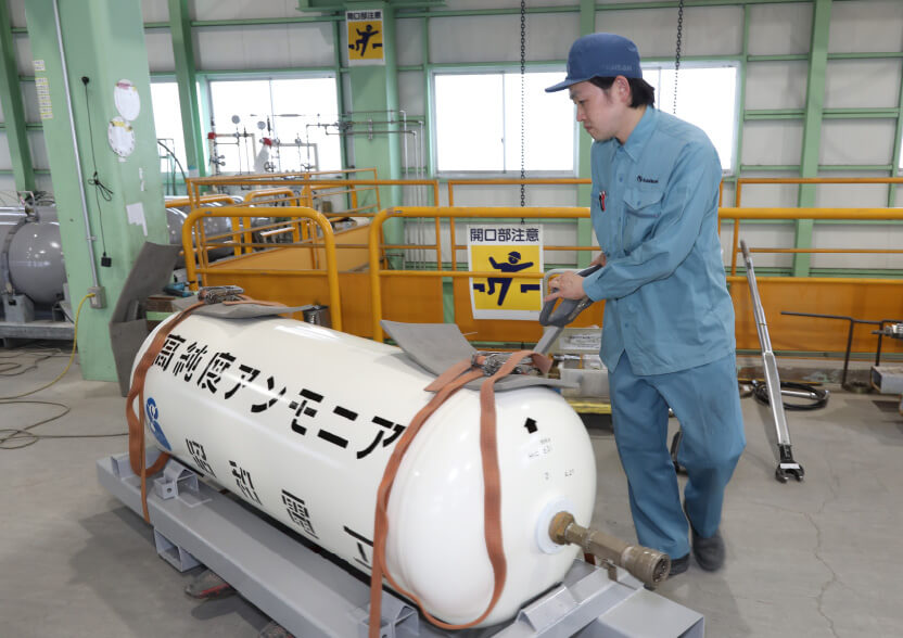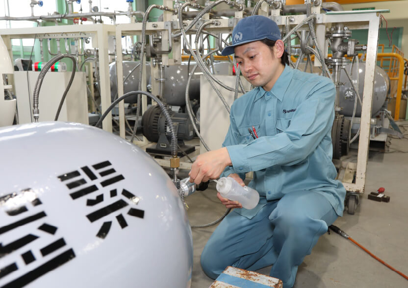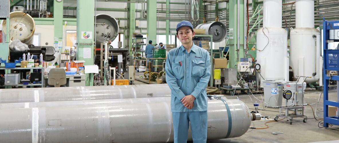 入社以来、ウルトラコンテナ工場で勤務しており、現在は、大型部門の出荷前最終工程を担当しています。ウルトラコンテナは、半導体製造用の超高純度ガスを充填するため、極めて精度の高いクリーン度が求められます。私が担当しているのは、お客様に引き渡す最後の工程なので、作業内容も繊細で集中力が必要です。また、現在は、半導体需要の高まりから、たくさんのご依頼をいただいています。ですから、品質を維持しながら、どうすれば、いかに作業効率を上げられるかを考えています。目標の出荷本数を達成できたときは大きなやりがいを感じますね。